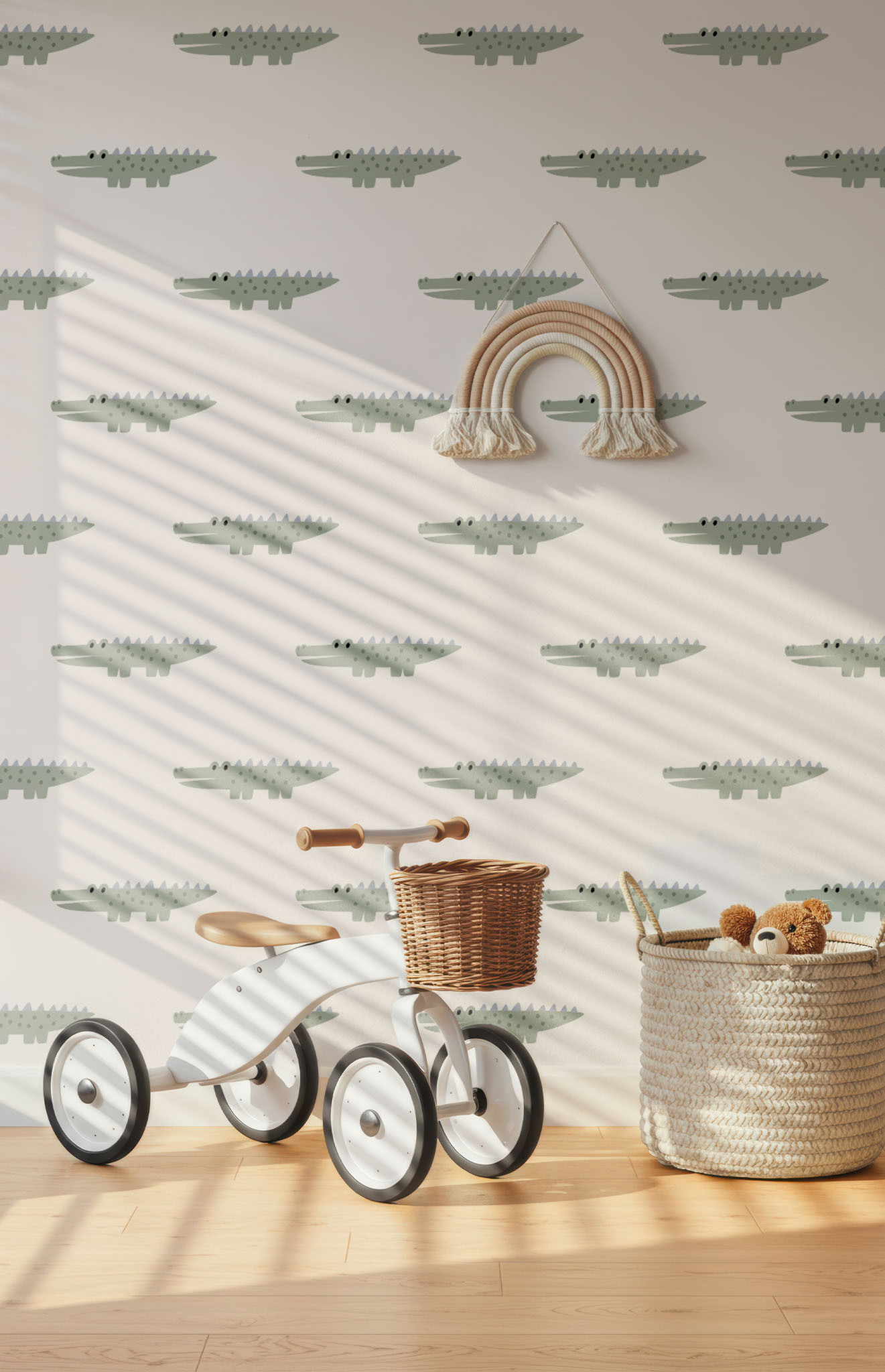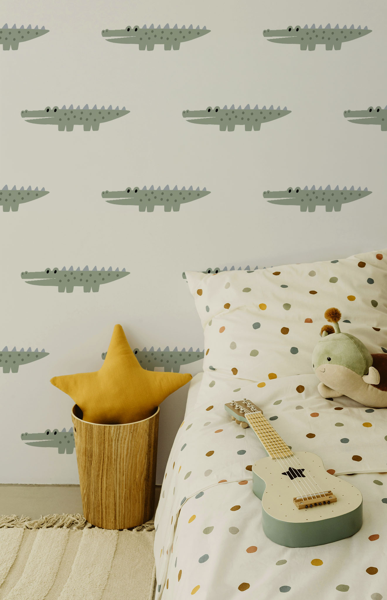 Forget the banal wall decorations and let yourself be seduced by our “Crocodile Rock” pattern! These adorable and mischievous little crocodiles are making a grand entrance into your home. Designed with a playful spirit, they are ideal for creating a cheerful atmosphere in a child’s room or even in a creative office. Each reptile stands out with its unmistakable smile, promising to transform any wall into an art gallery full of life. The geometric patterns of the scales add a modern edge to this design. This wallpaper is available in green, an elegant and varied choice that matches any ambience, whether in the living room, bedroom or playroom.