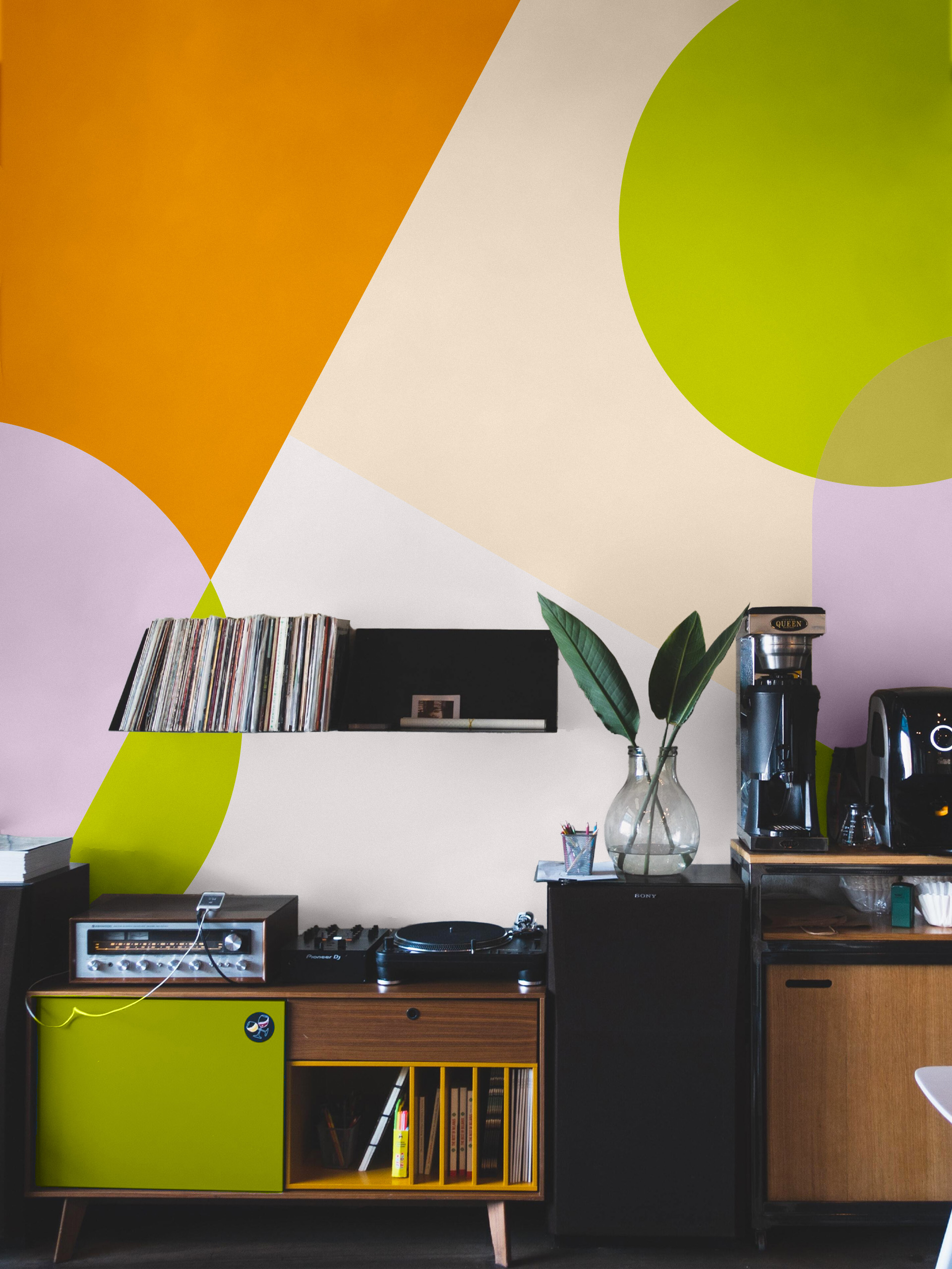 Give a modern and artistic touch to your interior with our asymmetrical wallpaper. With its colourful and asymmetrical patterns of squares, rounds and triangles, it is the perfect choice for those looking to introduce a trendy element into their decoration.