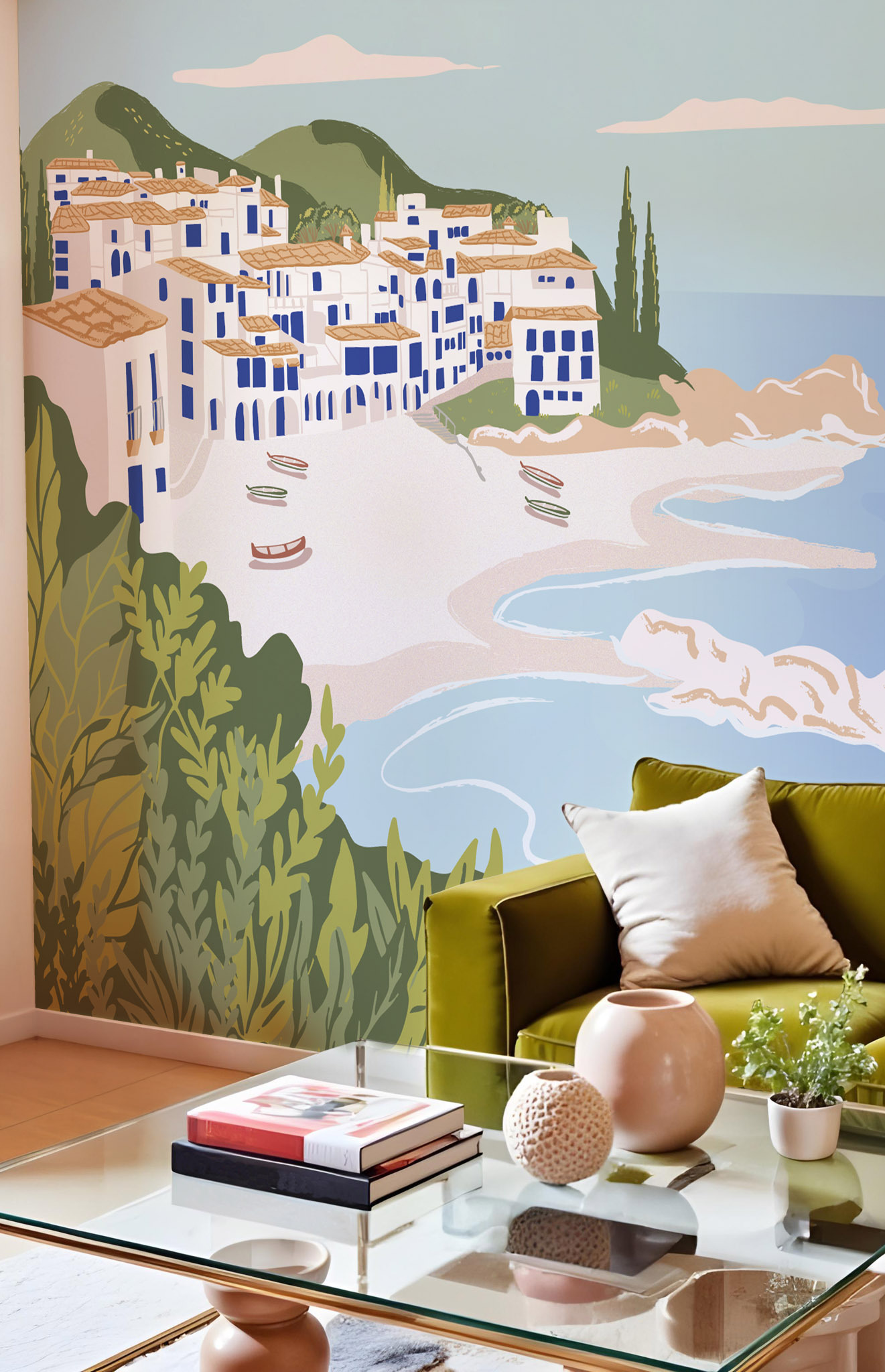 ¡Transpórtate a la orilla del mar con nuestro papel pintado «Costa Brava»! Este patrón evoca las encantadoras casas vernáculas de un pequeño pueblo español con vistas a las soleadas playas. Sus formas suaves y orgánicas se mezclan con el ardor de las olas y el exuberante follaje, creando un ambiente vacacional permanente. Perfecto en una sala de estar o dormitorio, este diseño es su escape diario a un mundo encantador.