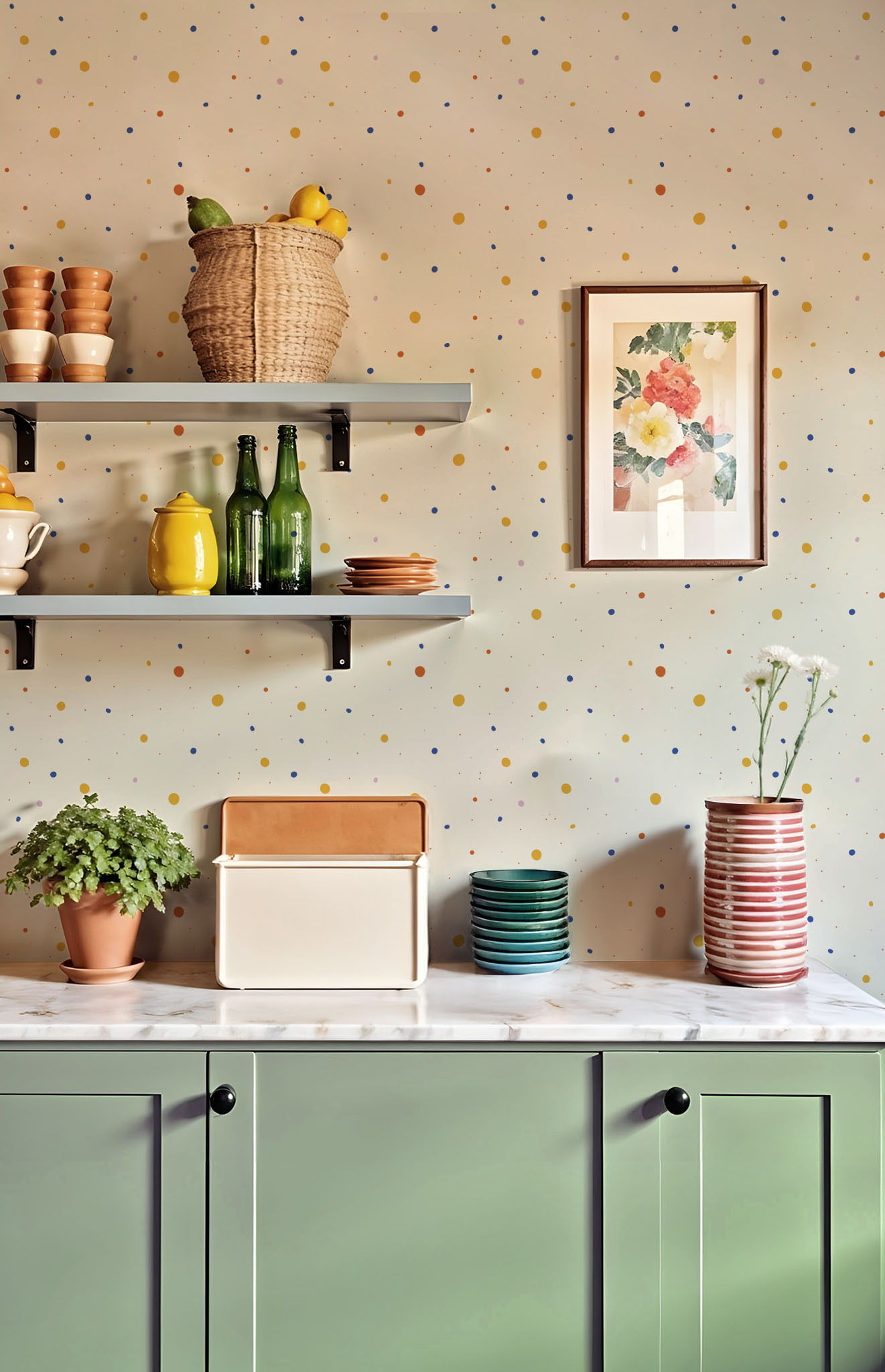 ¡Atrévete a despreocuparte con nuestro papel pintado «Fiesta de puntos!»! Un diseño brillante donde los círculos de colores se dispersan en tu pared como una lluvia de caramelos. Este divertido patrón calienta el ambiente, evocando un ambiente festivo y alegre, perfecto para decorar tu cocina o sala de estar. Las formas redondas invitan a la convivencia, haciendo que este espacio sea acogedor y lleno de personalidad. Disponible en varias variaciones, como verde, terracota y un multicolor brillante, cada versión seguramente seducirá a sus invitados. Perfecto para aportar vitalidad a cualquier habitación, este papel pintado se adapta a cualquier estilo sin comprometer la diversión.