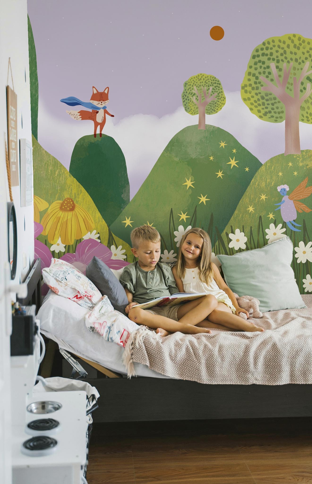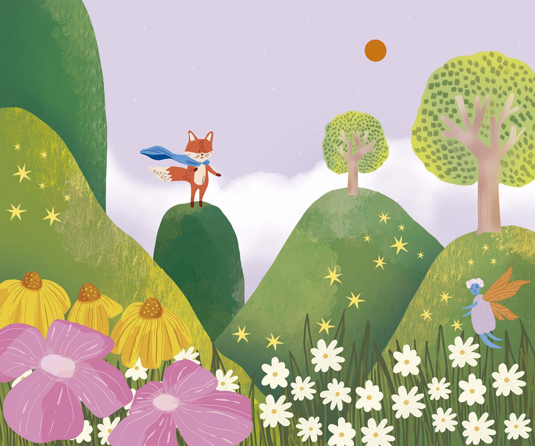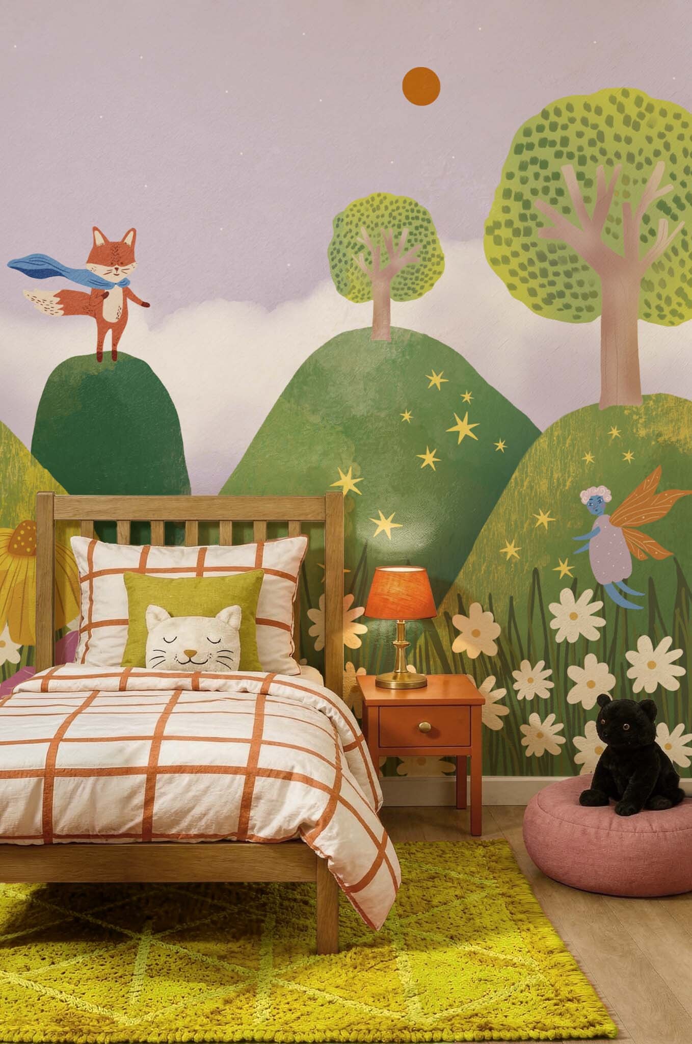 ¡Atrévete a aventurarte con nuestro papel pintado «Valle Encantado»! Sumérgete en un mundo donde colinas verdes ondulan en formas suaves y acogedoras, flores coloridas se agitan en una danza alegre y un audaz zorro se alza valientemente en su cima. Este patrón brillante es perfecto para inyectar una buena dosis de magia en la habitación de tus hijos, transportándolos a horizontes fantásticos con cada mirada. Con sus variaciones de verde y multicolor, este papel pintado encaja armoniosamente en todos los mundos infantiles, ya sean soñadores o bromistas. Es una oda a la imaginación, ideal para decorar las paredes de tu sala de juegos, dormitorio o incluso la zona de lectura. 🌳✨