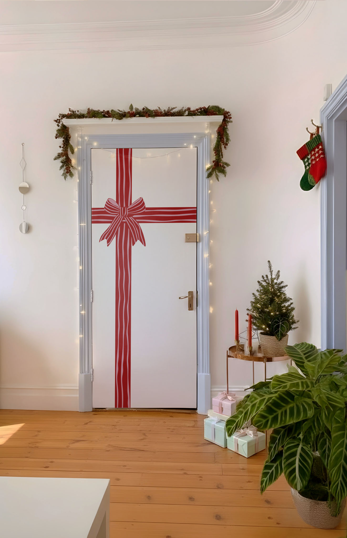 ¡Convierte tu puerta en un verdadero regalo gigante con esta pegatina de cinta roja! En un abrir y cerrar de ojos, tu entrada se convierte en la estrella de las fiestas, solo falta el papel de regalo y Papá Noel. 🎁
