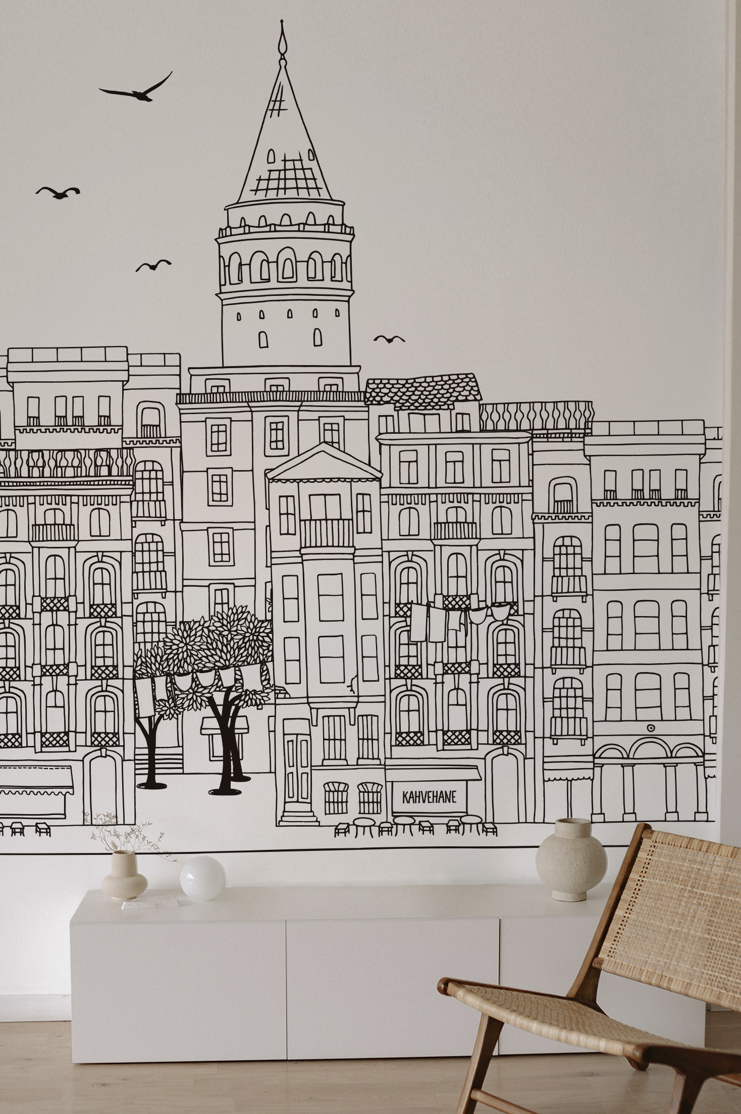 Le papier peint ‘Istanbul’ est un hommage graphique à la splendeur de cette métropole millénaire, illustrant ses minarets élancés et ses silhouettes architecturales en un dessin linéaire monochrome. Idéal pour apporter une dimension cosmopolite et une profondeur historique à tout intérieur, ‘Istanbul’ transforme les murs en tableaux narratifs.