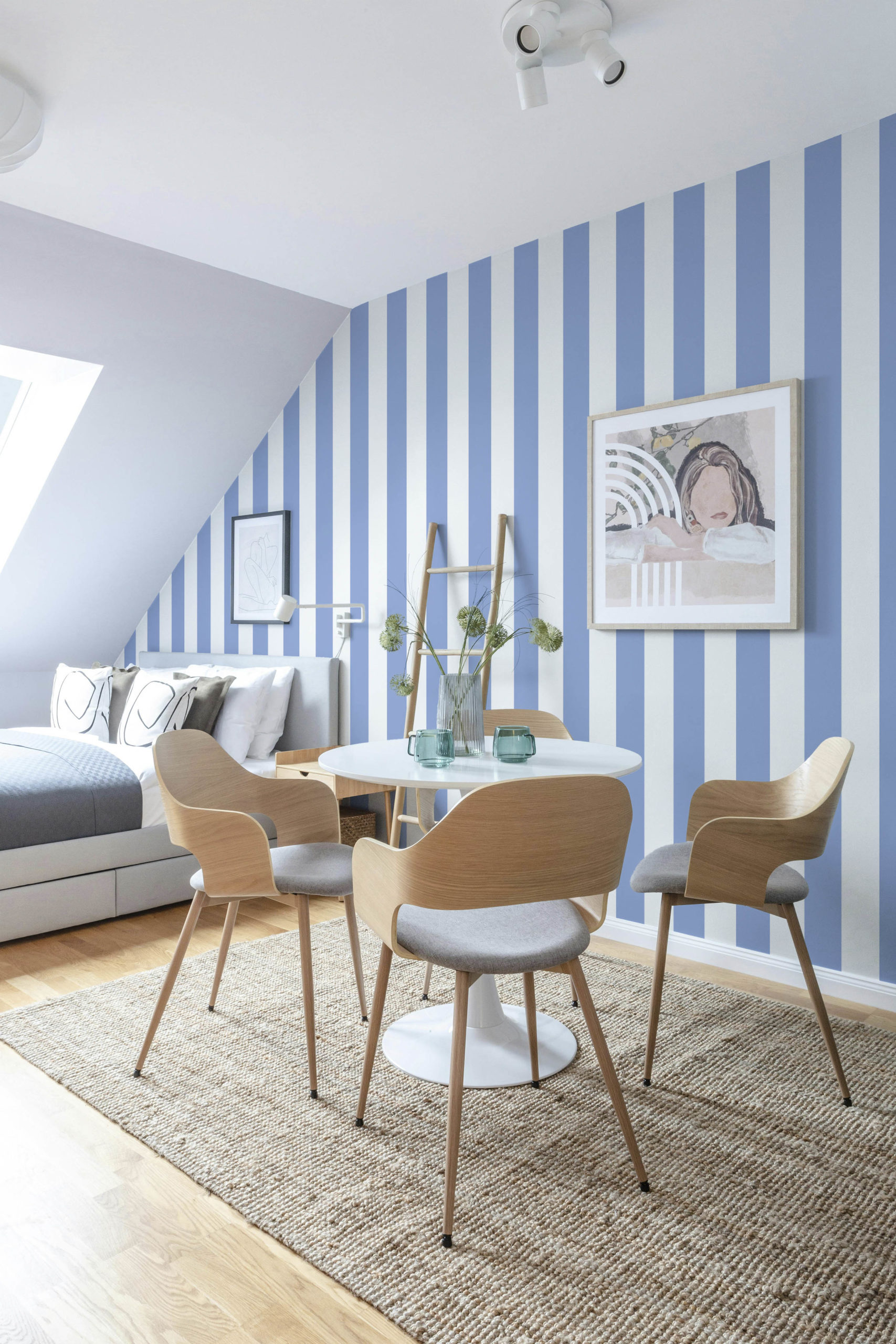 Le papier peint « Menthe Bleue » évoque la fraîcheur d’une brise marine sur fond de ciel dégagé. Ce design allie l’élégance des rayures fines à la douceur d’une palette de bleus pastels, créant une atmosphère à la fois dynamique et apaisante.