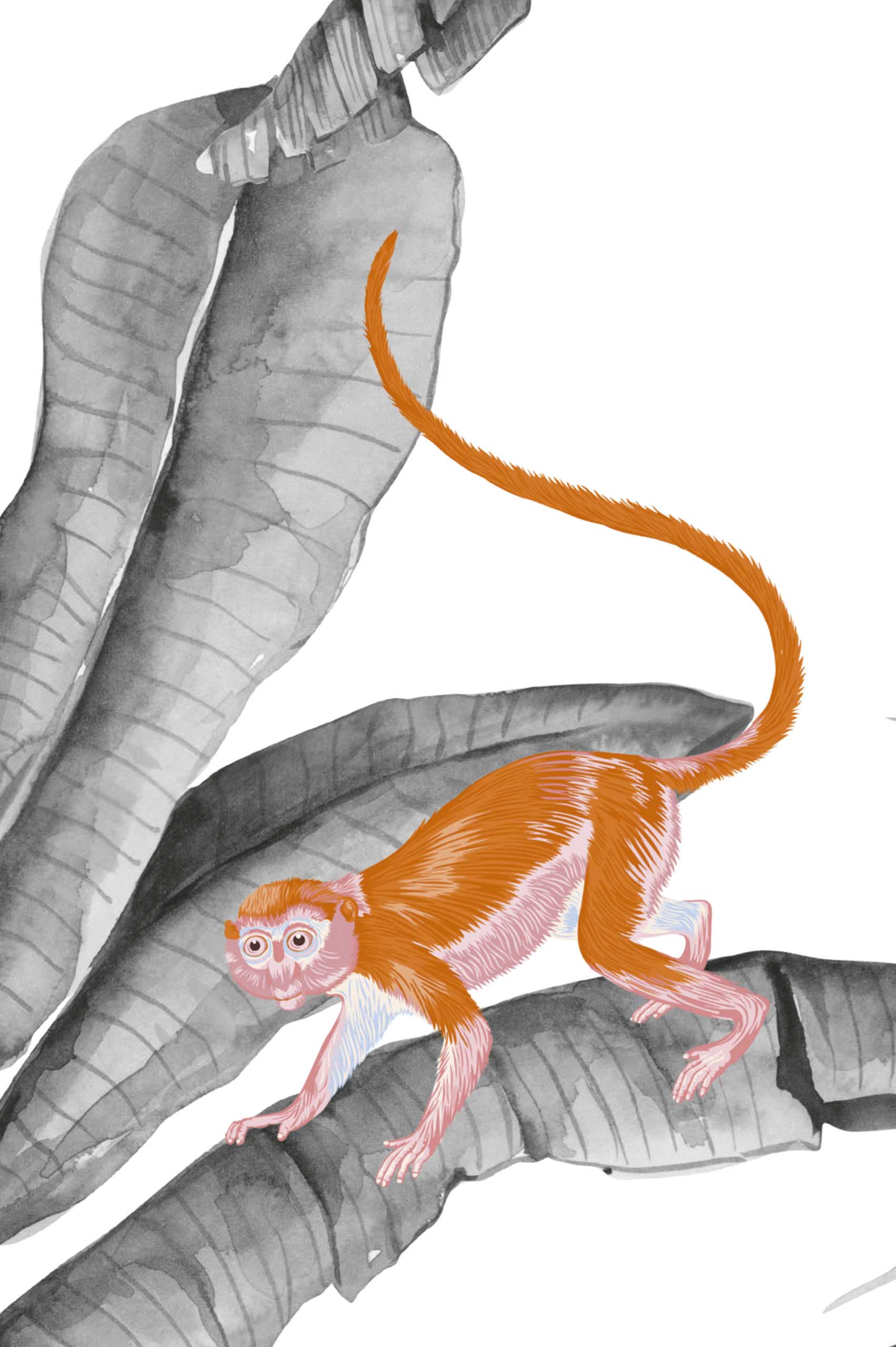Intégrez dans votre foyer l’esprit de la nature avec ce design qui marie la tendance contemporaine de la déco tropicale et la fantaisie ludique des motifs animaliers. Les détails soigneusement dessinés des feuillages et des palmiers ajoutent une profondeur et une complexité captivantes.