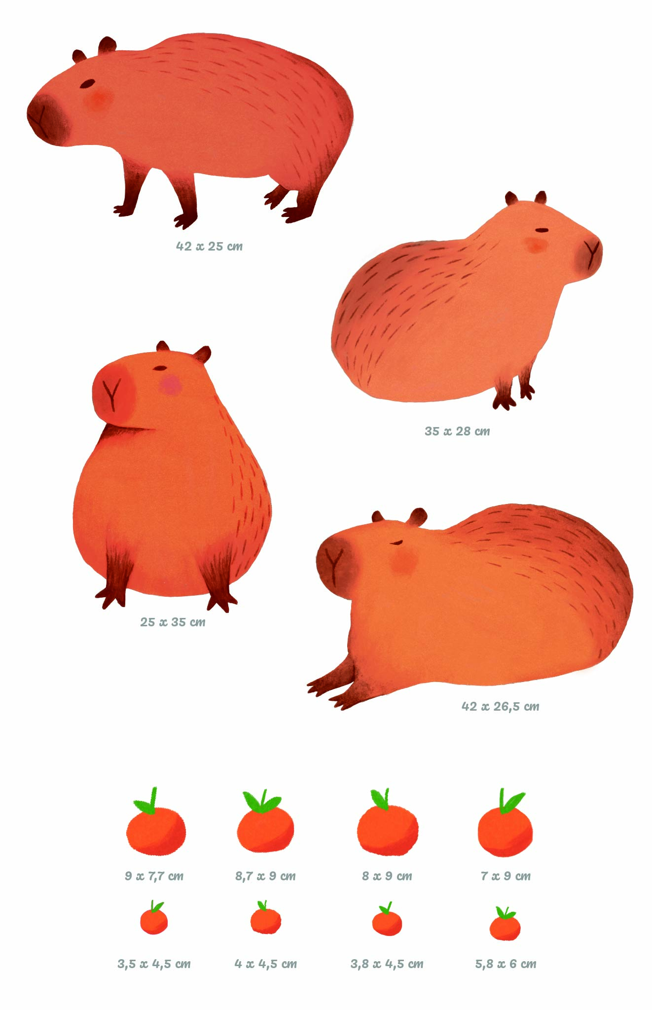 Les capybaras mesurent jusqu’à 42 × 26,5 cm, avec des formats intermédiaires comme 35 × 28 cm et 25 × 35 cm.